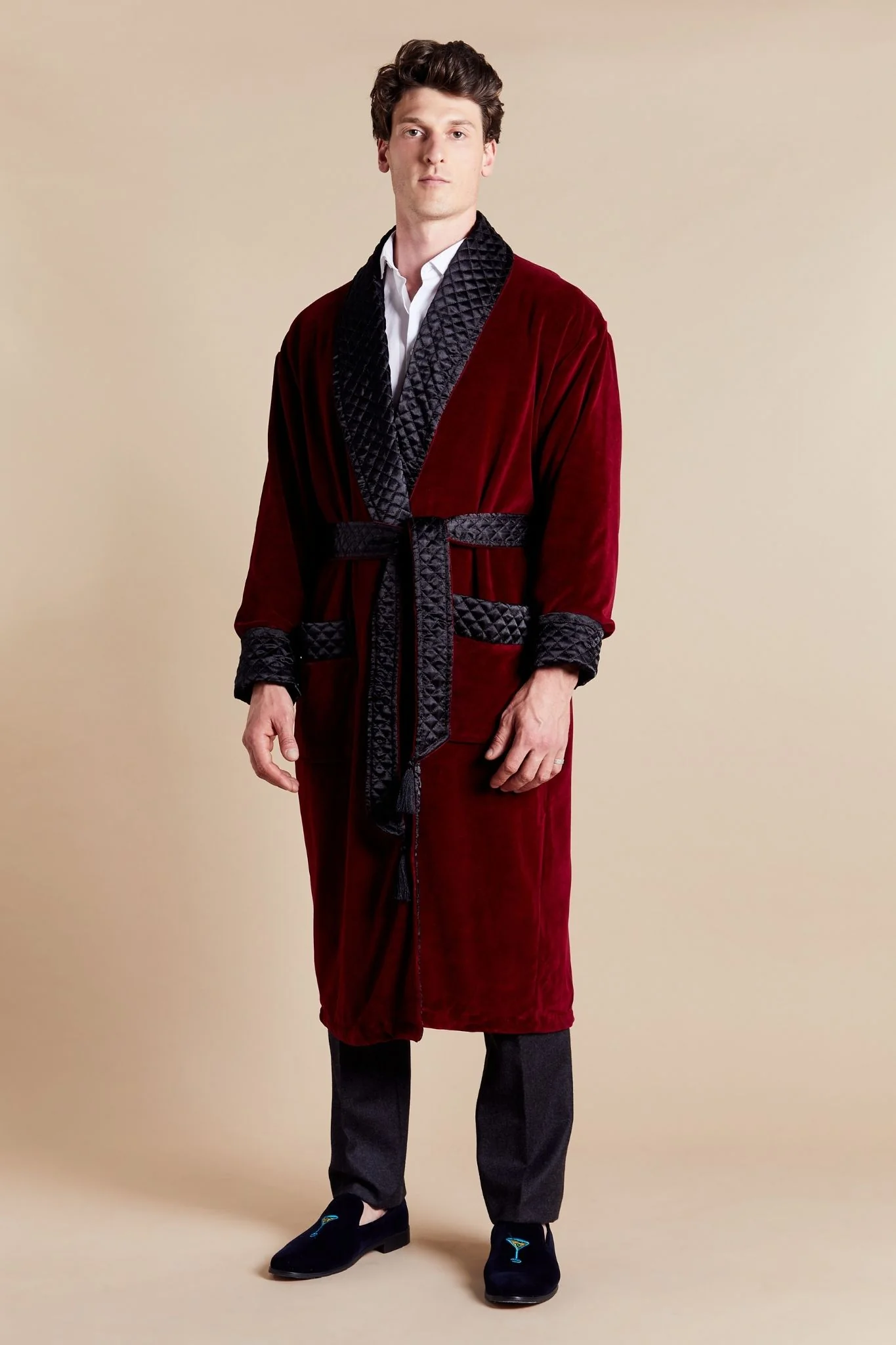 New to the Bown collection, the Astor Luxury Cotton Long Velvet Smoking Jacket in Burgundy. Crafted with meticulous attention to detail, this jacket exudes elegance and sophistication.