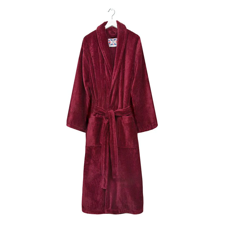 The Baroness burgundy cotton robe for women is every bit as regal as it sounds. A deep pile, velour bathrobe in rich burgundy with a stylish, half shawl collar and matching waist belt.