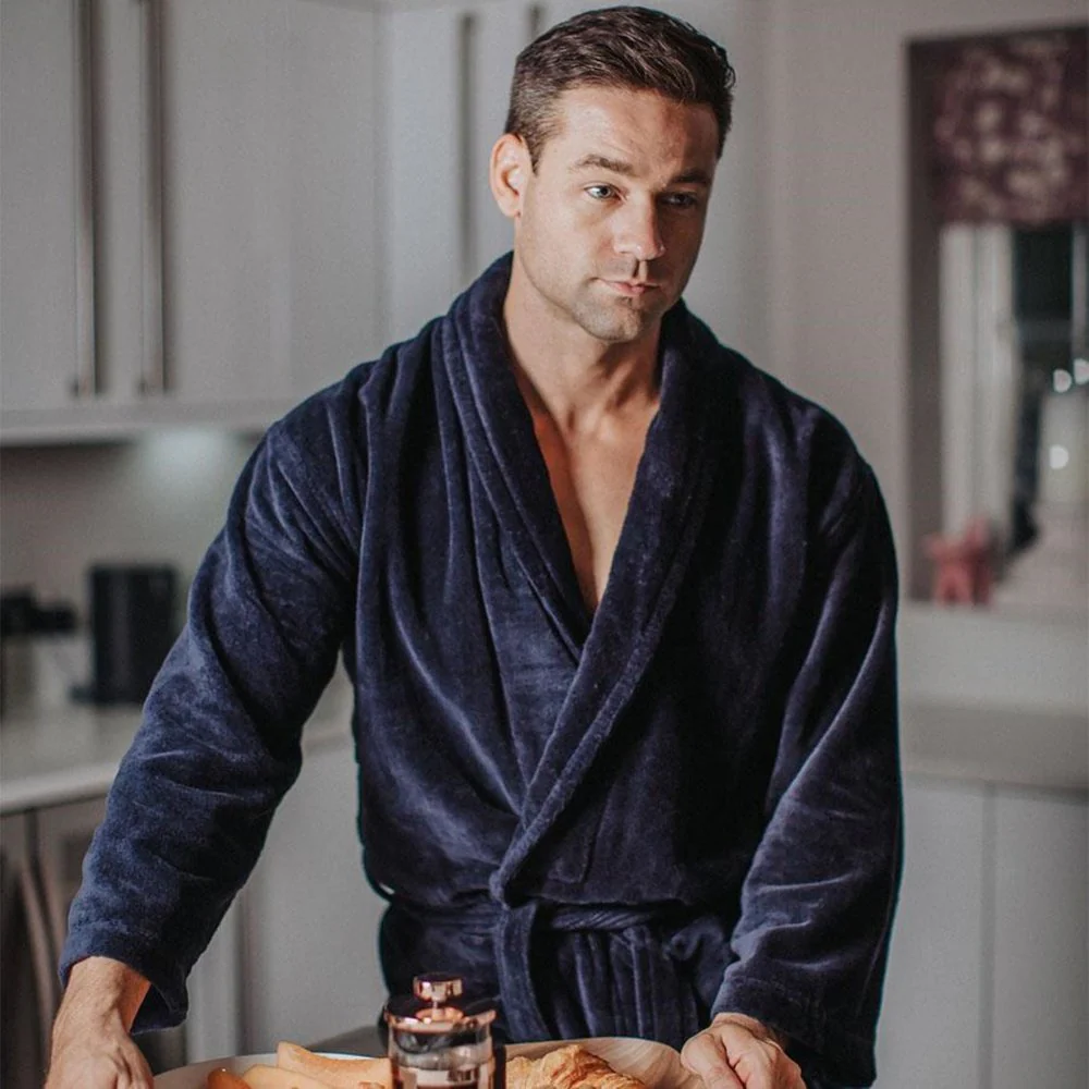 Give your loungewear a style upgrade with the luxurious Baron men's robe. The quality is clear in the deep pile, velour cotton bathrobe available in a classic navy - also available in a rich burgundy.