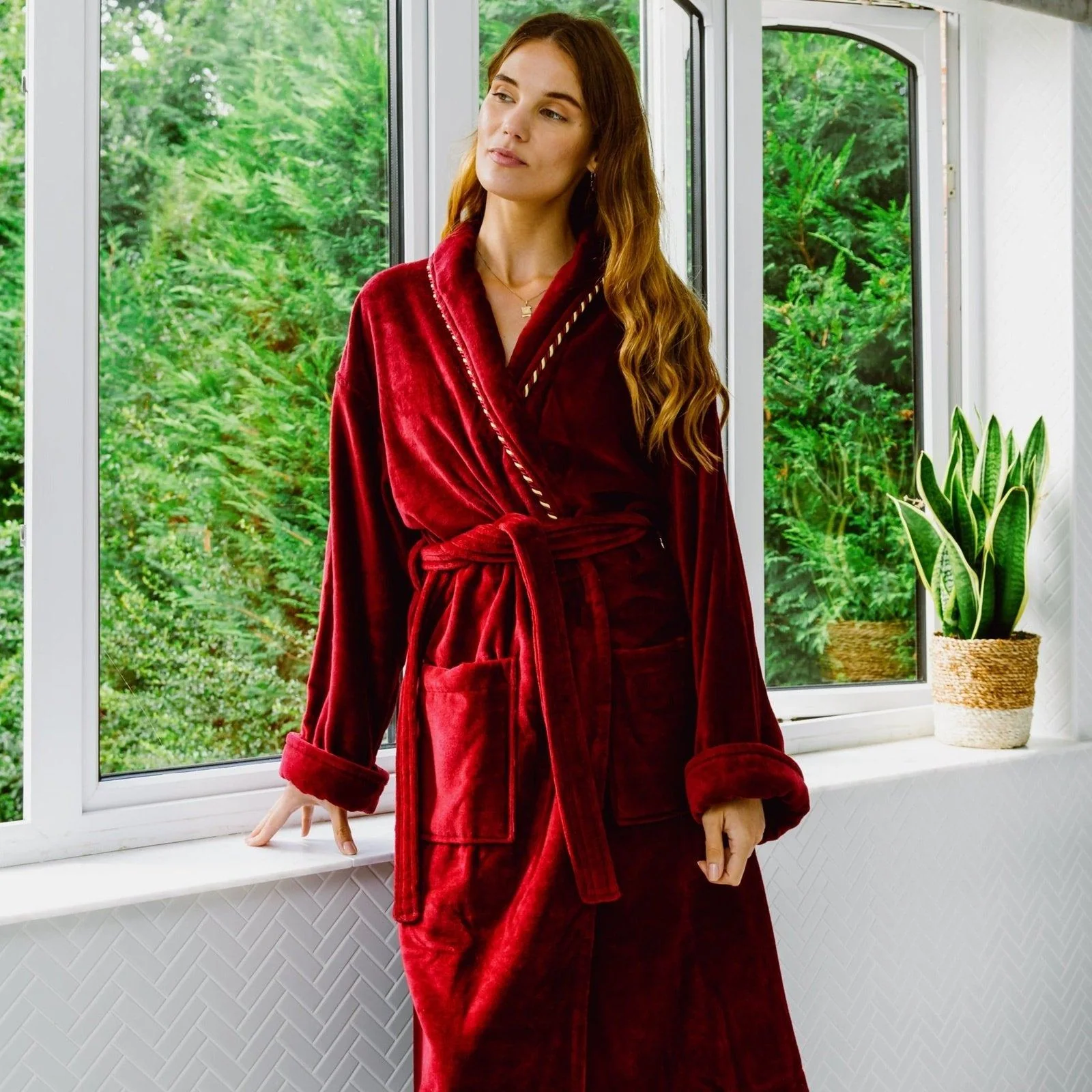 Featuring a wonderfully rich claret colour with a delicately detailed rope piping to the half shawl collar. Crafted from Egyptian cotton and featuring front pocket detail, fold back cuffs and double belt loops for a tailored fit you'll adore.