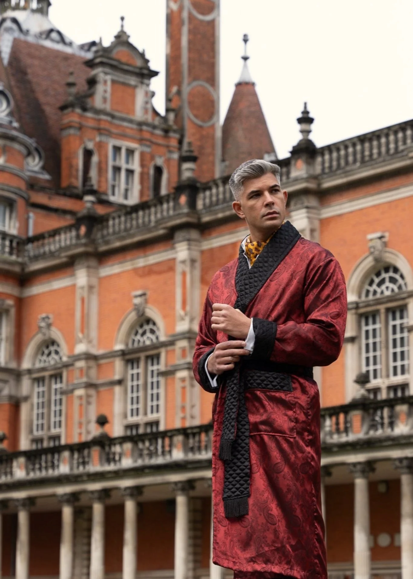 Gable, our full-length paisley-patterned smoking jacket joins the luxury collection of men's robes and gowns. This must-have loungewear essential is perfect for early mornings, late evenings and relaxed weekends. Team with skinny jeans and a slender tie and collar for elegant occasion wear or opt for relaxed pants and tee for a more casual take on this British classic.