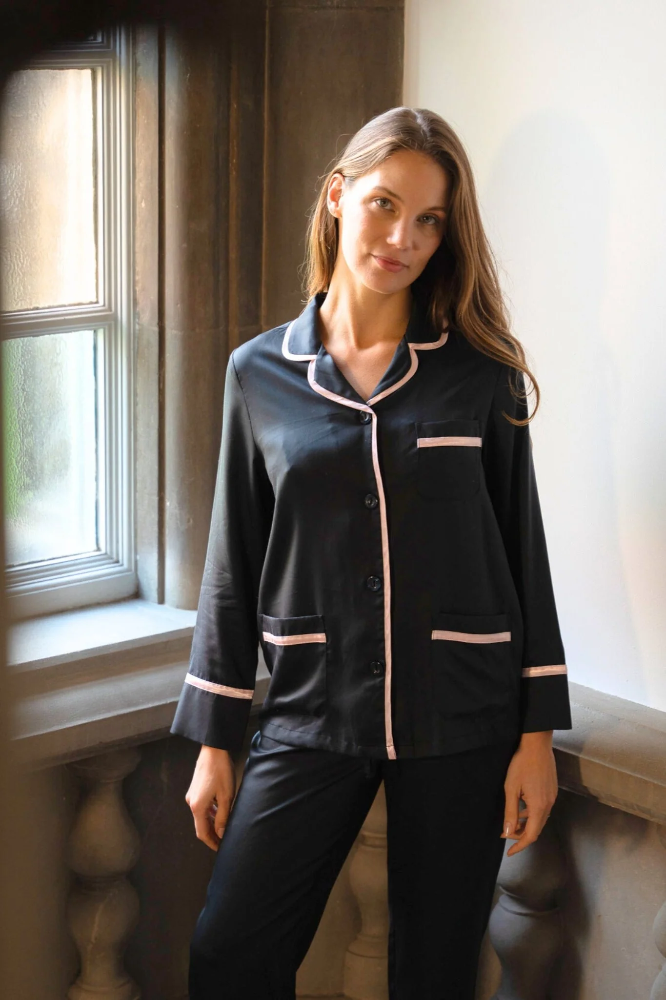 The Hera pajama set is thoughtfully designed with refined details like contrast piping, delicate buttons, and a convenient breast pocket. Whether you're indulging in a relaxing evening or enjoying a leisurely morning, this versatile and stylish pajama set will elevate your loungewear to a new level of sophistication and comfort.