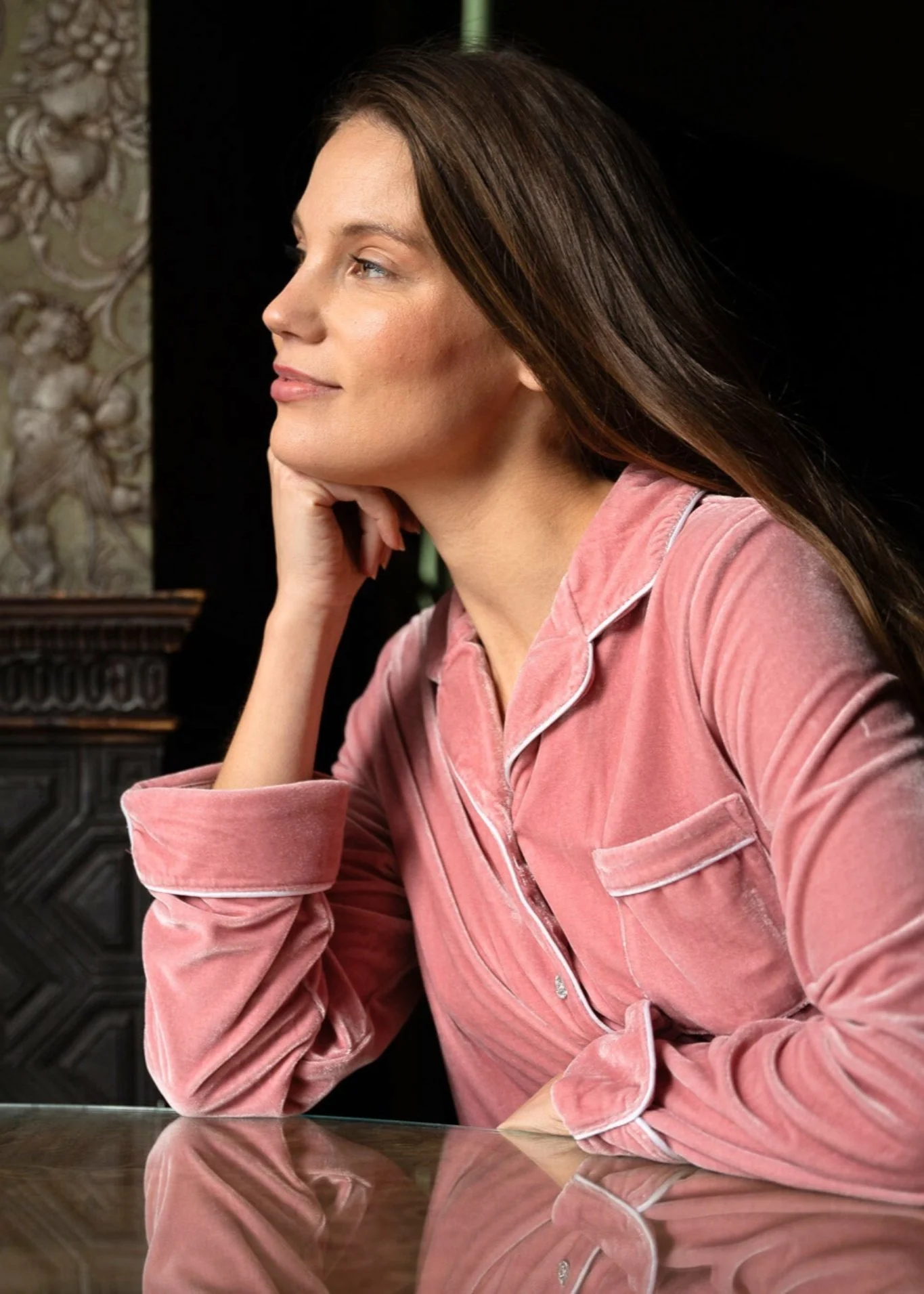 The Athena Ladies Pink Velvet Pajamas, a stunning addition to our luxury designer collection. Crafted from high-quality velvet, this elegant set offers a soft and warm feel against the skin. With a gorgeous pink hue, the tailored fit ensures both comfort and style.