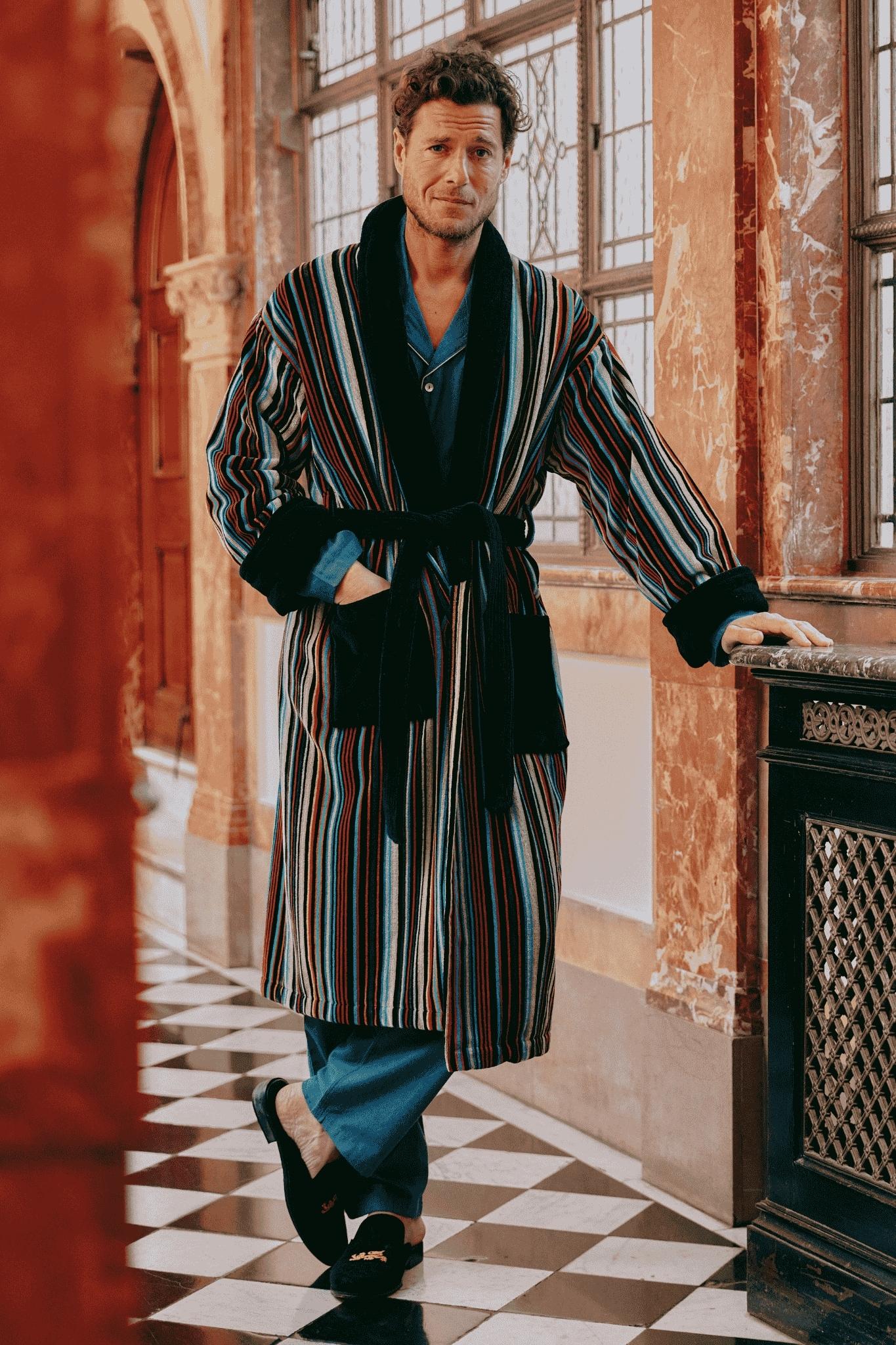 New to Bown of London - The Dundee designer gown for men is a captivating addition to Bown of London, boasting bold multicoloured stripes that beautifully contrast against the lustrous black velour backdrop.
