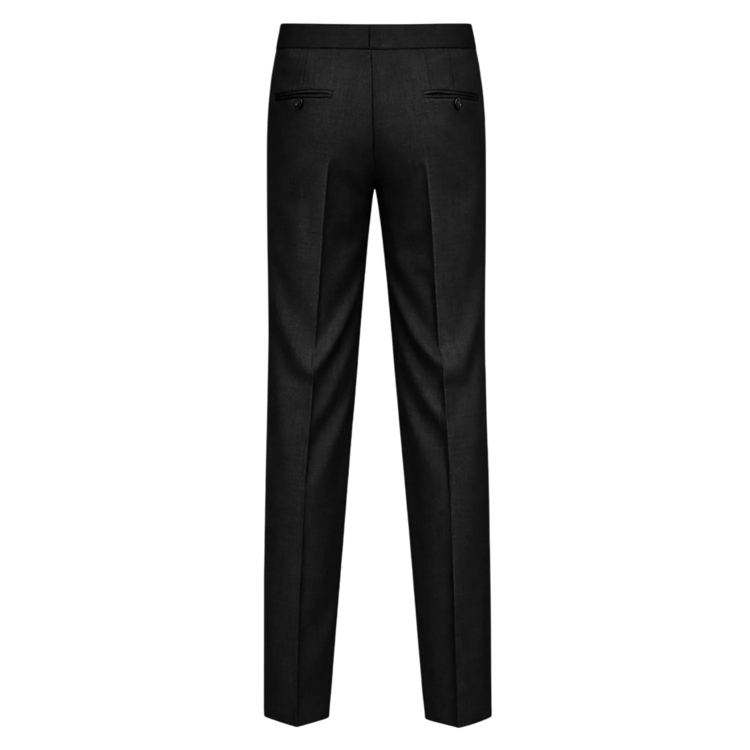 Bown of London trousers are made to your order by our tailor using a luxury wool-rich Vercelli super 100s, the black trousers' cut and style is shown in the photo’s featuring a stylish satin stripe on both legs of the trouser, two side pockets, an adjustable waist band and two rear pockets.