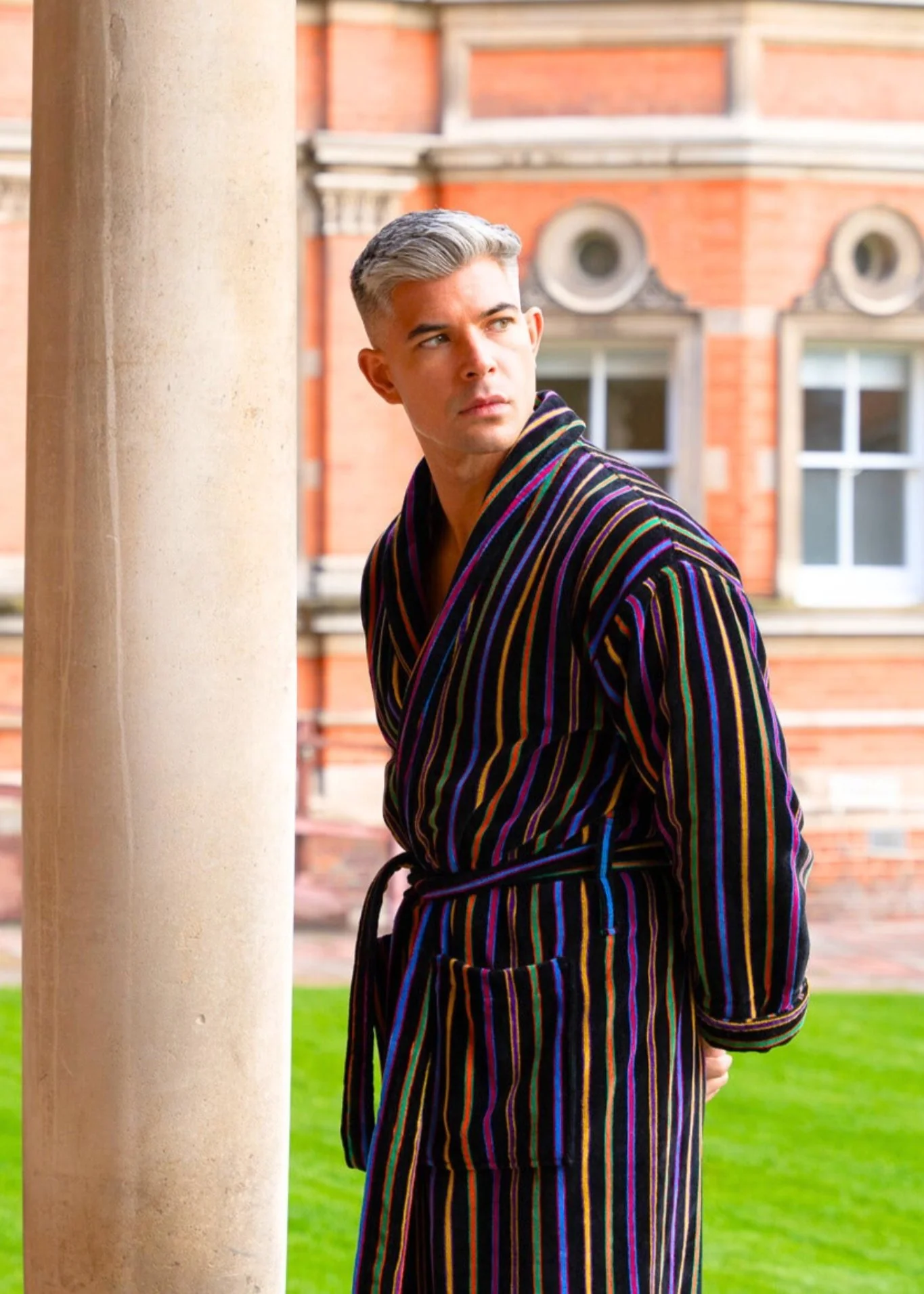 The Mozart designer bathrobe for men remains a best-seller, beloved for its bold, multicolored stripes set against a lustrous black velour backdrop.